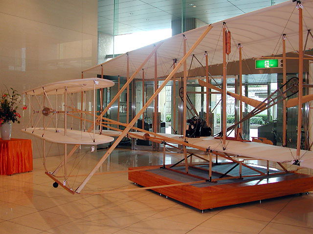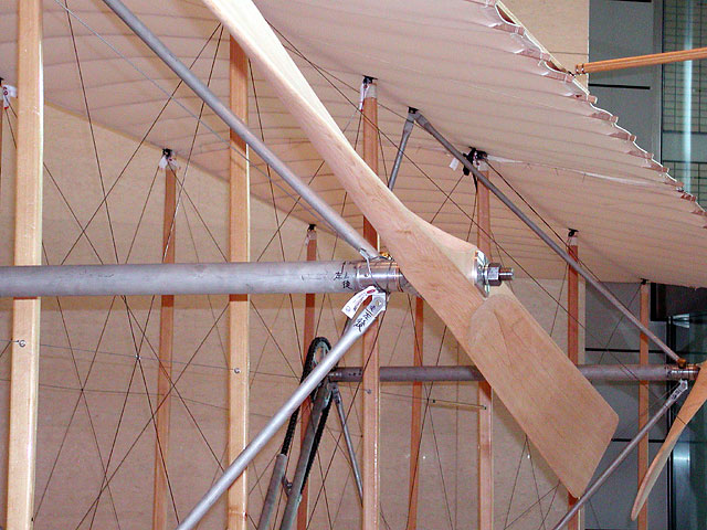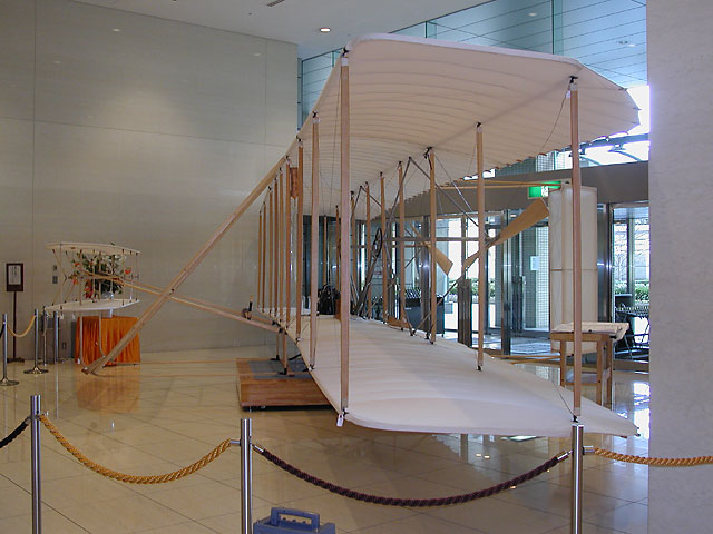 1月4日の朝、早速朝日浜離宮ホールにそのフライヤーを見に行ってきました。懐かしいやら嬉しいやら、新しい木目も鮮やかに白い翼のライトフライヤーが見事に蘇りました。手間と時間をかけてじっくり製作してきたのでしょう。構造材から翼布、取り付け金具、プロペラまで手作りです。プロペラは三枚の板を重ねて合板を作り、そこから手で削り出しています。その苦労が偲ばれます。昨年9月には鹿児島で展示され、11月に久住滑空場で組み立てテスト、そして12月には分解されたフライヤーははるばる東京までトレーラーで輸送され、二日間をかけて組み立てたのだそうです。製作は西日本航空協会の方々が担当されたのですが、何らかの形でこのプロジェクトに参画した人は2000人にのぼるとか。大プロジェクトです。