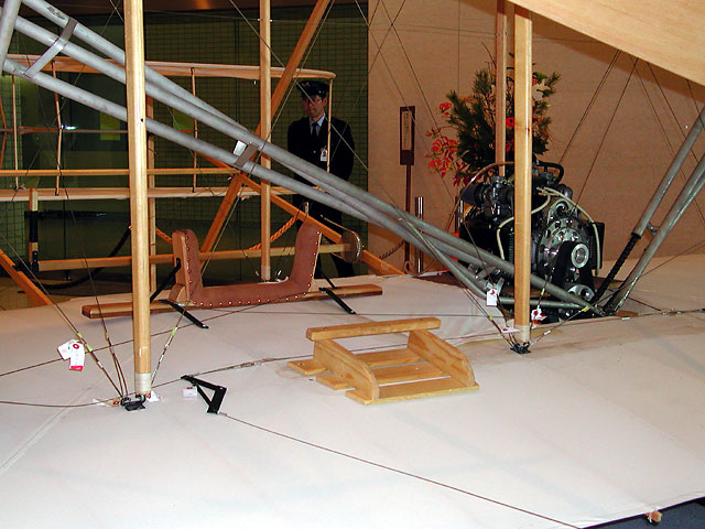 それから、このフライヤーはオリジナルのようにモノレール上を滑走して離陸することはできません。航空局の規則により、このフライヤーにも陸上を滑走するためのタイヤをつけなければならないのです。しかし木製の細い橇(そり)を構成している部材には車輪をつけるための強度が足りないとか。補強しなければならないようです。法規上はこのフライヤーは自作飛行機のカテゴリーに入るそうで、飛ぶ前になにやら色々検査もあるとのこと。いかにも日本のお役所らしいですね。ということで、実際の初飛行は今年(2004年)の夏に行われる予定とのことです。