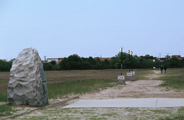 ライト兄弟が実験に使ったモノレールが敷かれ、4回にわたる実験飛行の距離がわかるように着陸地点に標識が立てられている。12月17日、最初の飛行はオービルが操縦し、交代にテストパイロットになった。オービルが最初に達成した12秒、飛行距離120フィートが人類初の動力飛行として記録された。その後操縦に慣れてきた兄弟はさらに飛行距離を伸ばし、4回目のウィルバーが59秒で852フィートを飛行し、フライヤーが多少損傷を負ってこの日の実験は終わった。朝10時半から始められ、4回の実験飛行が終わったのは12時だった。