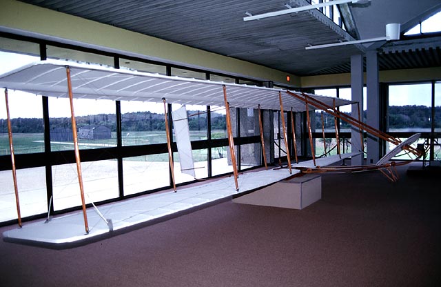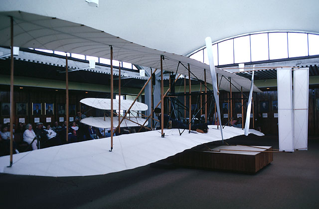 ビジターセンターになっているライト記念館の中はライト兄弟関連の品物が展示されている。1903年のフライヤーの実物大モデルも展示されていて、その前で係員が、撓み翼の原理、なぜ垂直尾翼(方向舵)が必要になったかなどについて、誰にでもわかるように丁寧に解説してくれる。実際にコントロールワイヤーを動かしながらの説明なので、非常にわかりやすい。これは英語が苦手な人でも理解できる。このへんのプレゼンはほんとに上手いよ、アメリカ人は。
