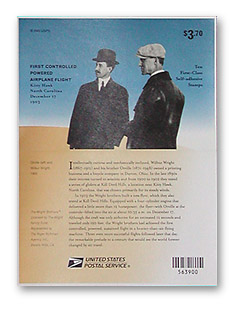 ![]() | アメリカでは2003年5月にライト兄弟の動力飛行から100年を祝して記念切手が発行されました。 左は発効日の消印の入った記念封筒。下は10枚組みのシートでシールのように台紙がついています。額に入れて飾って置きたいくらいきれいな出来栄えです。日本のショップでも買えますが、アメリカのUS POSTAL SERVICEのサイトでも注文できますよ。まとめ買いするならば郵送費を入れてもUS POSTAL SERVICEで購入したほうが安いですね。まだ在庫あります--2004.1.8 |
